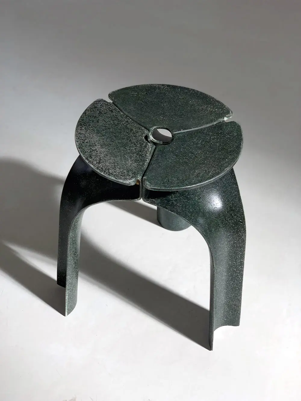Triplex es un elemento experimental de mobiliario que supera los límites físicos de un taburete, desde la estructura, el peso y las dimensiones hasta el montaje, la entrega y la vida posterior. No tiene precedentes en la industria. El módulo está hecho de fibra de lino, uno de los materiales de celulosa natural más fuertes. Diseñado con una geometría curvada estratégicamente, el taburete de menos de 3 mm de grosor se alza elegantemente sobre sus arcos y abraza el peso que lleva. Crédito de la foto: Whitnie Yvette Lau, Dennis Cheung; Koelnmesse.