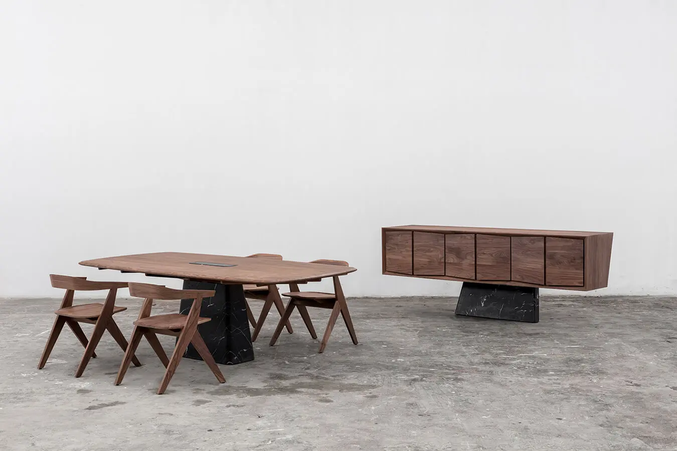 Creada por Héctor Esrawe, Manuel Bañó, Federico Stefanovich y Alejandro Ramírez, para Esrawe Studio, esta colección que incluye una mesa de comedor, sillas auxiliares y un aparador, es una continuación del desarrollo en el portafolio de diseño escultural y de autor, del estudio mexicano.