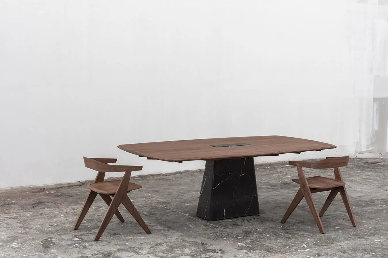 La Colección Dolmen se basa en la exploración y búsqueda del balance entre elementos opuestos y con materialidad distinta. Este ejercicio exalta las propiedades físicas del mármol y la madera de nogal, creando una tensión entre el elemento suspendido y el elemento de soporte.