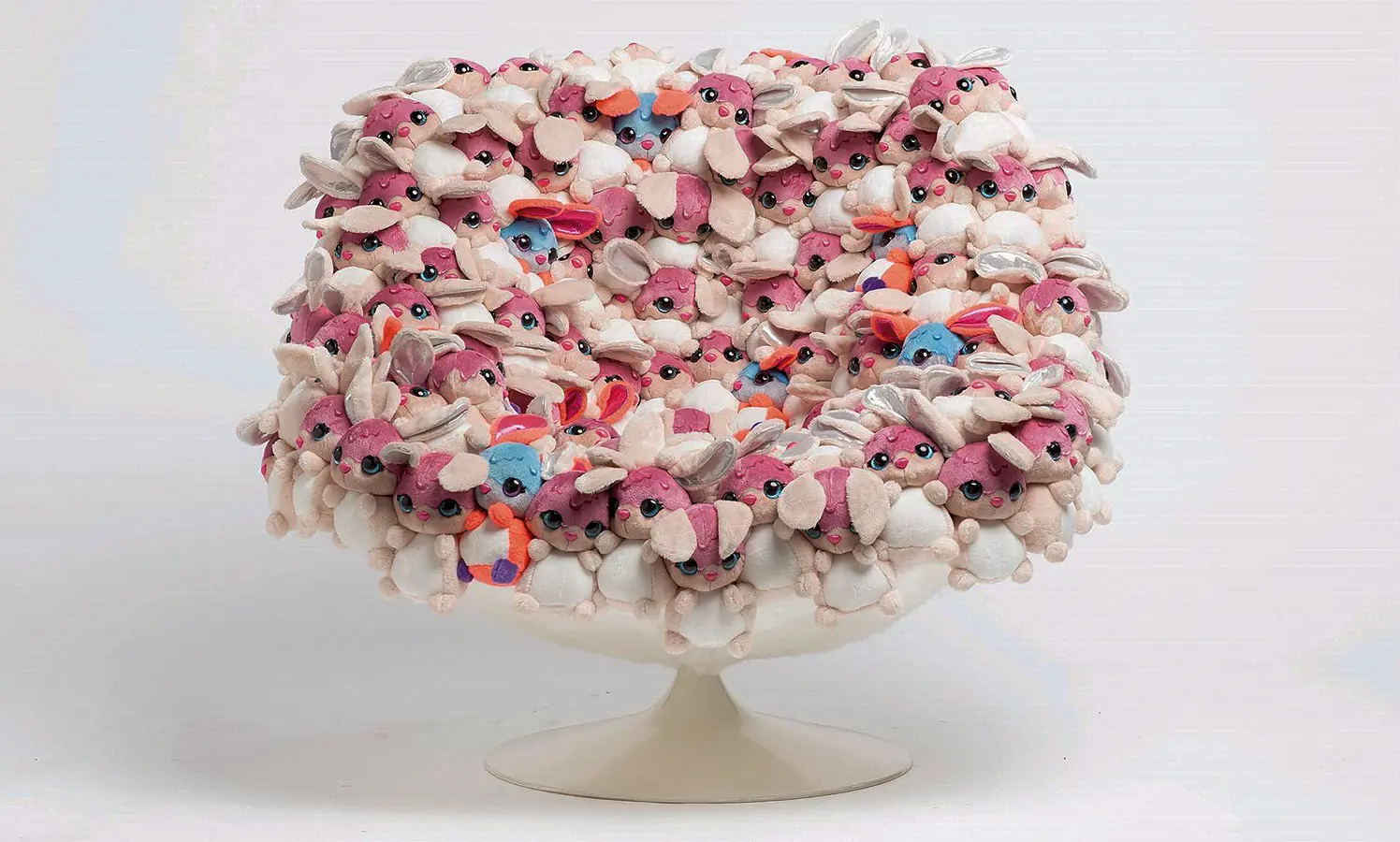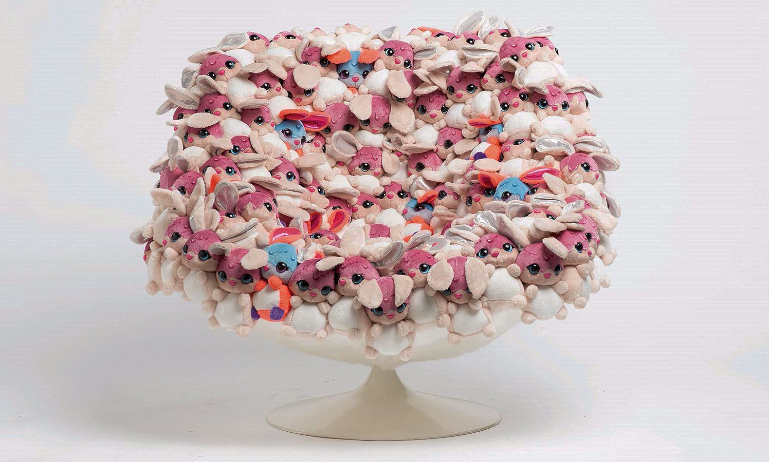¿Qué cambio importante estará destacando en la exposición? Los sillones muestran formas cada vez más envolventes; Abrazan las caderas, proporcionan apoyo lumbar. Su diseño se ha ajustado para calmar nuestros dolores. Hoy en día, una silla cómoda debe ser una especie de pieza anti-shock para nuestros cuerpos doloridos. Nos gusta anidar en los pliegues de tela tan gruesa como edredones – basta con mirar la cubierta de Marie-Christine Dorner para Cinna o Nuvola de Paola Navone para Gervasoni. ¡La silla ideal es básicamente un cojín apoyado en cuatro patas! una almohada en las piernas. Esto es lo que parece la silla de sueño, que alivia las tensiones físicas y lava cualquier problema que pesa en su mente. Y, seamos honestos, también es una manera divertida de humor del niño dentro de cada uno de nosotros. Tome esta silla AP Collection, por ejemplo, la cubierta con decenas de animales de peluche: claramente traiciona nuestra necesidad de anidar.