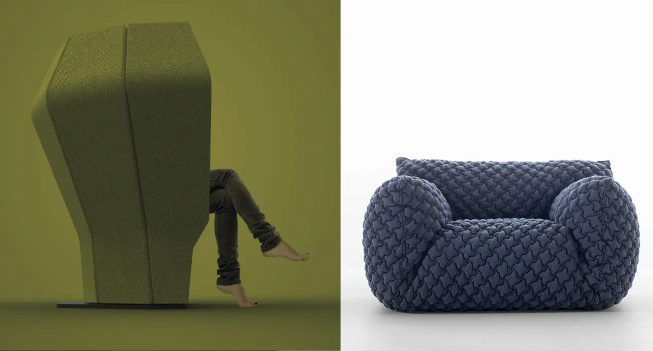 ¿La comodidad está limitada a los interiores de nuestra casa? No, la comodidad está llegando fuera del hogar a la esfera pública: estaciones de trenes, salas de espera, cines, etc. Los productos presentados en la feria hacen posible que el trabajo se realice por sí solo. Cápsulas montadas en la pared, tabiques móviles, revestimientos de pared aislantes, elementos ergonómicos que cambian nuestra percepción de comodidad. La gente trabaja de pie, ahora, también, y cuando tienen que sentarse, lo hacen en sillas de bola isocinética, bolas de Pilates, taburetes tambaleantes. Paradójicamente, la falta de comodidad es nuestra nueva idea de confort.