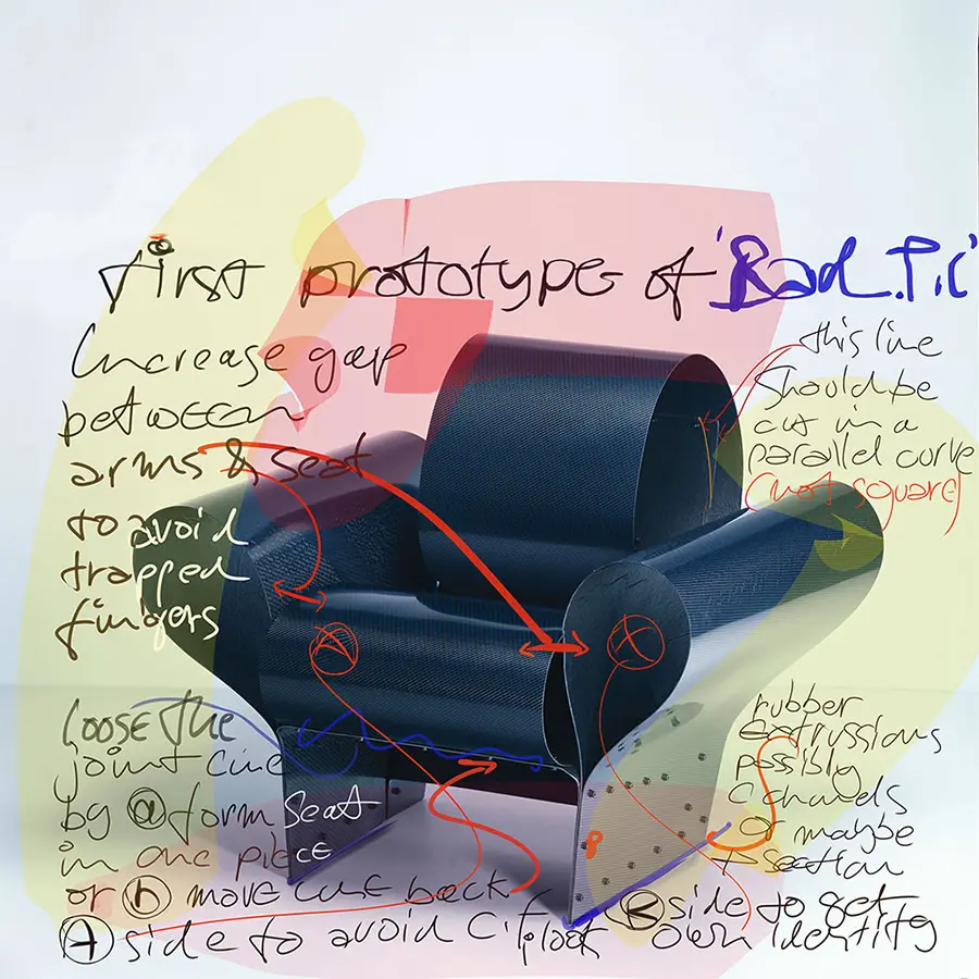 La obra de Arad no solo rompe las fronteras tradicionales entre el arte, el diseño y la arquitectura; una y otra vez, ha hecho que sus conceptos experimentales y rebeldes sean accesibles a los métodos de producción en serie y, por extensión, al mercado de masas. La exposición presenta ejemplos como la «Silla FPE» (1997) para Kartell o el «Sillón Tom Vac» de Vitra (1997), que ilustran la conexión entre estos productos industriales de gran éxito y los trabajos anteriores del diseñador. Hoy, el estudio de Arad en Londres, Ron Arad Associates, está activo en los campos de diseño de productos y muebles, diseño de interiores y arquitectura. La firma ha ganado renombre por obras arquitectónicas como el nuevo Design Museum Holon (2006-2010) o el interior del Watergate Hotel (2012-2016) en Washington, DC. Estos ejemplos también demuestran la afinidad de Arad por las formas voluminosas, las materias primas y el barrido curvas: en el mundo del diseño de hoy, con su alto grado de comercialización, todavía hay un lugar para las creaciones inconformistas que evaden las expectativas prevalecientes.