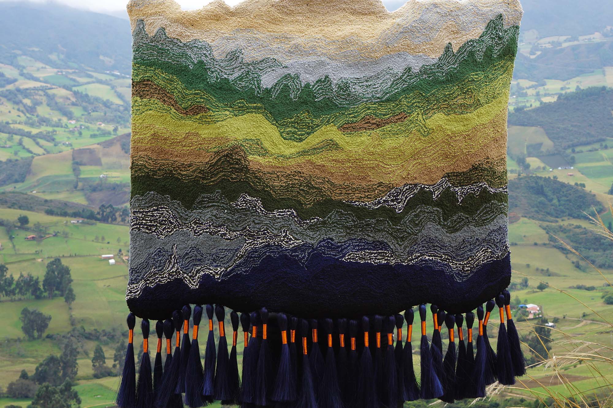 Hilos de múltiples colores son transformados en interpretaciones artísticas de los Andes, la cordillera que nos marca como país. Mediante la técnica de hand tufting —que consiste en bordar la tela con una pesada máquina, cuya forma es similar a la de un taladro—, la diseñadora y artista textil Vanessa Valero compone tapetes y tapices que juegan entre el diseño y el arte.