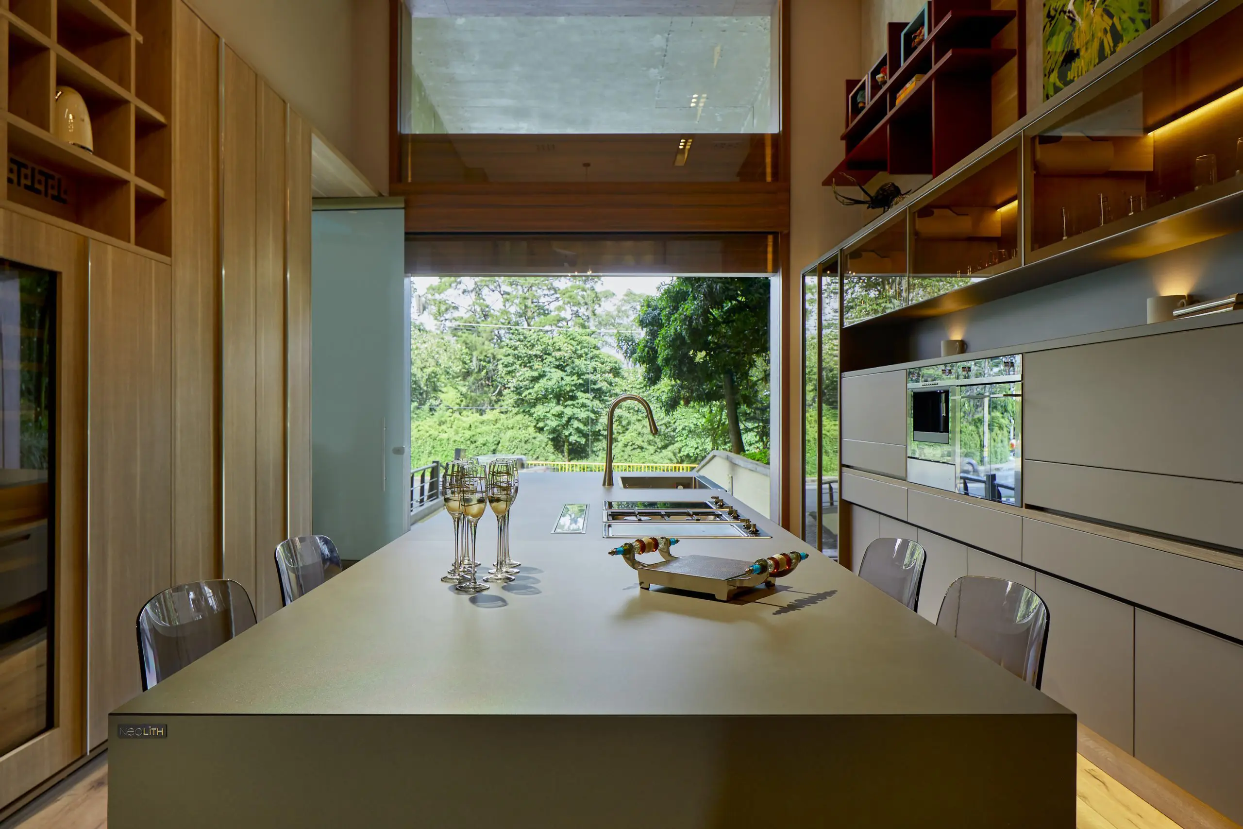Como parte del showroom de la empresa DYE Diseños y Espacios, en Medellín, esta cocina hecha en Colombia se integra con la privilegiada vista al entorno natural por medio de amplios ventanales. Sobresalen sus mesones y puertas de la referencia Neolith Barro, una piedra sinterizada resistente al rayado y las altas temperaturas, con componentes ciento por ciento naturales, distribuida en el país por la firma Vianova.