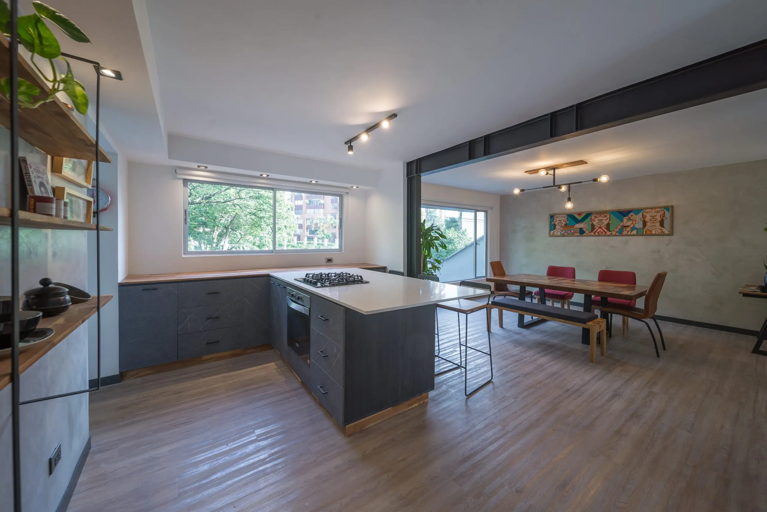 Integrada totalmente con el comedor, esta cocina del proyecto Cantarela, en Medellín, con diseño y construcción de espacios de Mosaiko Studio, presenta tableros aglomerados en colores ónix y carbón, de la más reciente colección de la compañía Madecentro, que contrastan con las superficies blancas y los acabados en madera y microcemento. La isla, área funcional que alberga electrodomésticos como el horno y la estufa, comparte su orientación con la mesa para generar un diálogo entre las dos zonas. Estos tableros vienen en dos denominaciones: estándar y resistentes al agua; su medida supera los 2 metros.