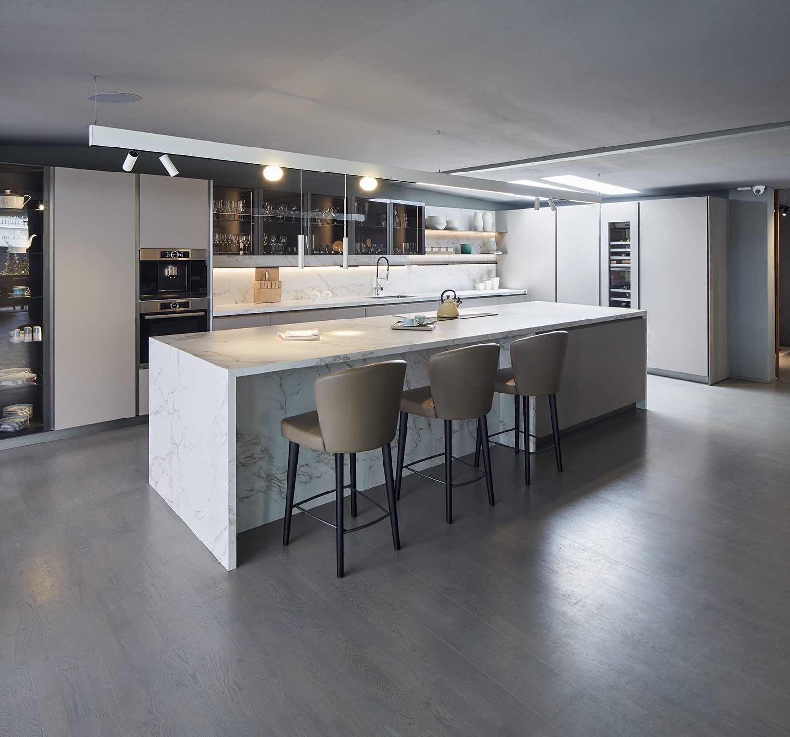 Parte de la línea Prime, de la firma italiana Dada –representada en Colombia por la compañía Schaller–, esta cocina, creada por el diseñador industrial Christian Peláez, tiene detalles minimalistas, pero adapta pequeños gestos clásicos como los colores tierra mezclados con toques de madera, así como tonos oscuros y piedras blancas. “El principal objetivo de esta línea es proporcionar espacios abiertos, con los que puedan interactuar los usuarios. Aparecen las repisas horizontales y las vitrinas como un complemento muy importante que aporta belleza y elegancia”, afirma Peláez. La luz artificial desempeña un papel importante, está presente dentro de los muebles de la cocina y sus alrededores, con “perfiles de iluminación cada vez más pequeños, que son imperceptibles visualmente pero cumplen una función muy específica: iluminar una zona de trabajo o enfatizar los contrastes de ciertos materiales, como la piedra Dekton, referencia Entzo, que usamos”. En cuanto a tecnología, esta propuesta posee tomas eléctricas motorizadas que salen del mesón e iluminación interior de cajones con encendido automático.