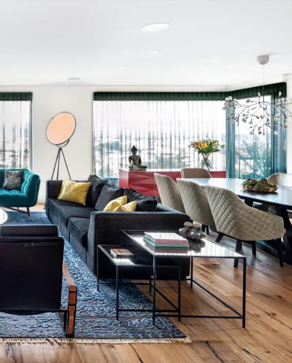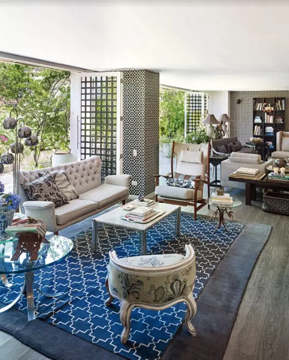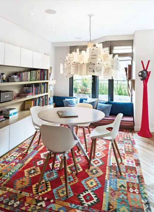 3. para gustos los colores y en cuestión de estos podemos escoger tonos neutros como el gris, el beige y el avena y el taupe, pues nunca cansan y salen con todo. Si la propuesta es más arriesgada y lo que se pretende es que el punto de atención sea el tapete, la idea es tener un mobiliario neutro y seleccionar una pieza artesanal como los coloridos Kilims o clásicos persas, su presencia aporta color a los espacios. Si lo que se pretende es un look más contemporáneo, los prints geométricos son una maravillosa opción.