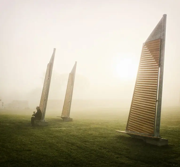 El concepto es simple: una obra inusual donde la gente se pudiera sentar cómodamente y contemplar el sonido del viento y las olas a las orillas del río St. Lawrence. Con estos conceptos claros, el diseñador creó una banca que integra mobiliario urbano y funcional. Fue así como imaginó las majestuosas velas en roble blanco, hormigón y metal. El roble elegido por Guyon es la misma madera que se utilizó en el siglo XVII para la construcción de veleros y barriles.