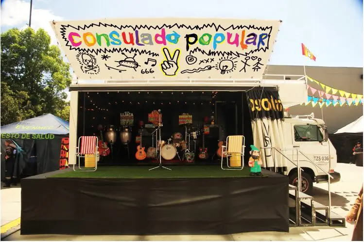 Al camión le agregaron elementos decorativos, inspirados en los festivales de música europeos. Extensiones de luces, banderines, carteles de buses, pósteres y tres tipis que sirven también para sostener todos estos elementos. El resultado fue una tarima equipada conbackline, luces y sonido para 1.200 personas.Justo antes de iniciar la gira con “El Tanque de la Paz”, como lo nombraron, Consulado Popular decidió, además de promocionar su música, invitar a bandas locales en cada municipio para que usaran su escenario como plataforma de difusión. A esto se sumó la iniciativa de convocar emprendimientos locales y propuestas gastronómicas, a través de las alcaldías, para crear un verdadero ambiente de festival.