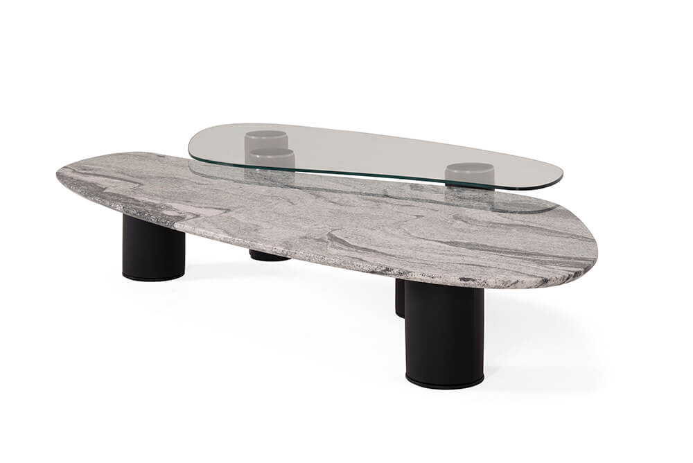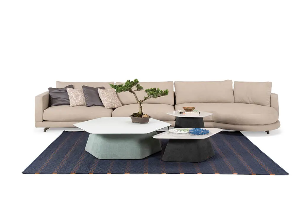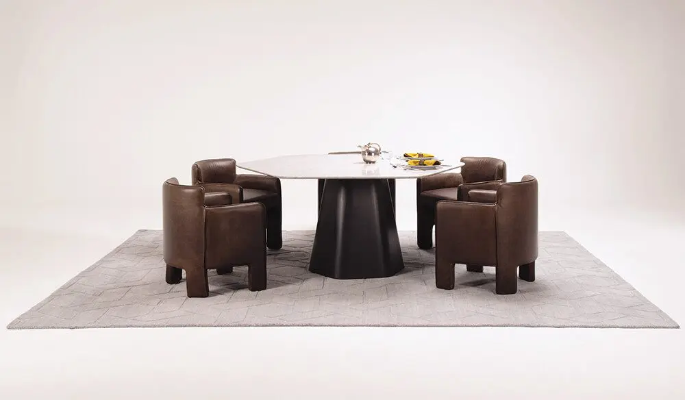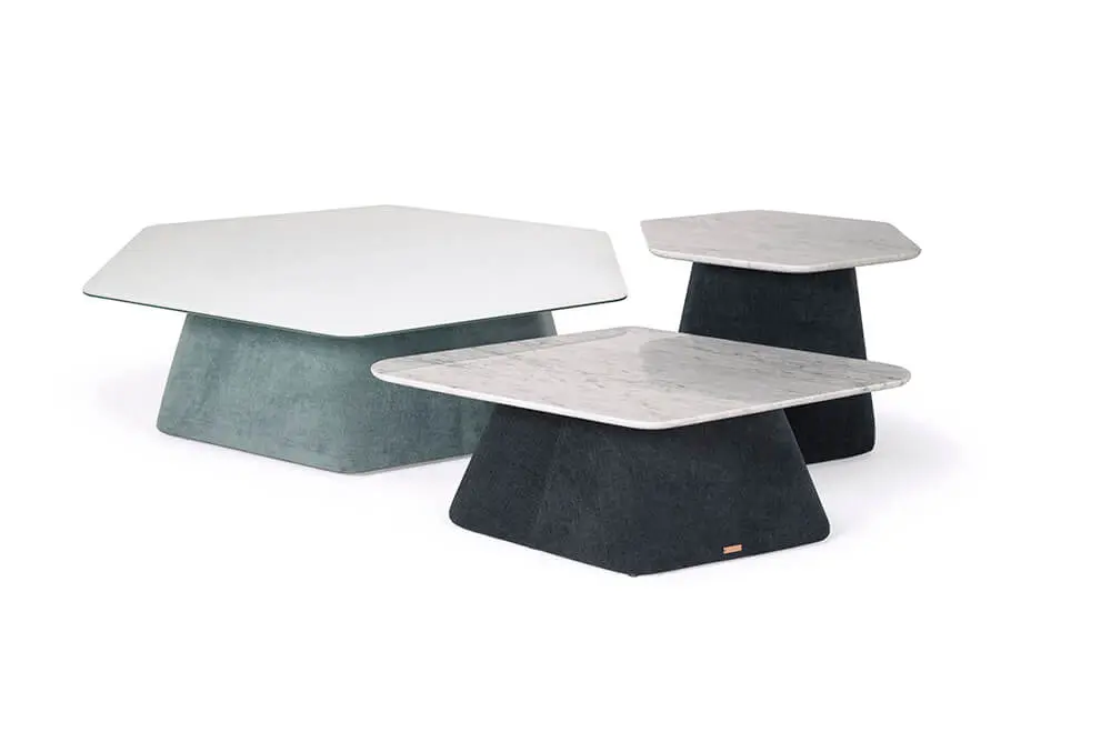 Matt se divide en dos partes. Esta vez a diferencia de las anteriores colecciones, no solo se encuentran las formas clásicas y orgánicas de las mesas Platanero –parte de esta nueva colección–, inspiradas en la hoja de palma de plátano, y que tiene tapa de mármol y patas de cuero, sino que como gran novedad añadieron varias piezas de cortes geométricos como hexágonos, círculos o rectángulos que podrá ver en la base de mesa de centro Honey.