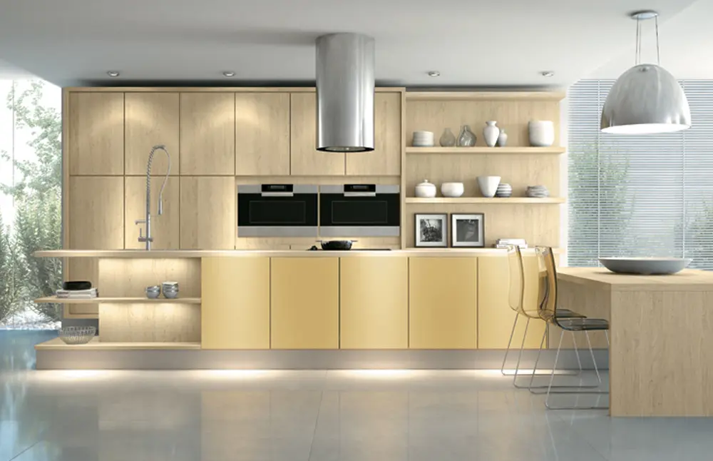 Con bases en chapilla natural color roble, esta cocina pertenece a la línea Dune, de la firma iltaliana Pedini, distribuida por Eurodeco. Puede tener salpicadero alto en vidrio templado y laqueado brillante, y ofrece modulación que permite integrar muebles de cocina con los de la sala de estar.