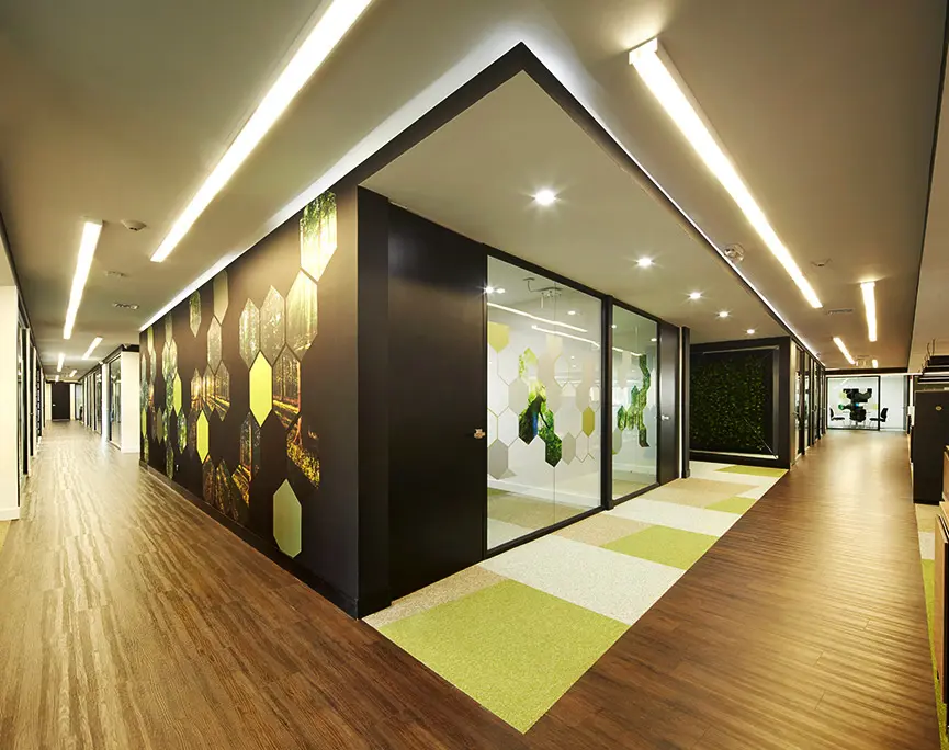 Biotoscana Colveh1, multinacional farmacéutica, decidió reagrupar sus oficinas en un solo piso para dar especial atención a las áreas colaborativas con un aspecto actual y para implementar elementos naturales que requirieran poco mantenimiento.