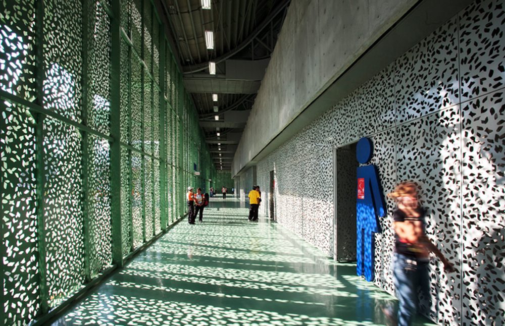 El PVC de los techos y las mallas de acero perforado que marcan el límite entre el espacio público y el deportivo dan una luminosidad ideal y permiten un flujo controlado de las corrientes de aire que recorren a Medellín. Con ello se consigue una temperatura ideal al interior y, de paso, un gran ahorro de energía, pues no requiere aire acondicionado y reduce el consumo de luz eléctrica.
