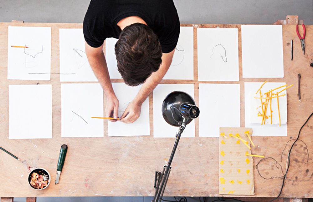 Fue en los últimos semestres cuando empezó a descubrir que el dibujo académico que conocía, ese de trazos perfectos, proporción y escala, podía desarrollarse de otra manera. “No estaba seguro de qué quería dibujar, hasta que Lucas Ospina, profesor de la facultad, me mostró que había muchas posibilidades de hacerlo. Para mí, fue romper con los cánones de lo que consideraba un buen dibujo. Entendí que no se trata de cómo está hecho, sino del mensaje que este tiene”.En su primera exposición, Adentro y en Medio, López instaló su taller dentro de la galería Casas Riegner para mostrar, en una especie de actoperformático, cómo era el proceso de su trabajo. Todos los días, durante el horario de la galería, dibujó los objetos que utiliza habitualmente: tijeras, reglas, hojas y borradores. Presentó un mundo ilusorio que invitaba al espectador a corroborar si era real lo que veía. “No quería pensar el dibujo como algo plano, sino como algo que se puede recortar, armar y volver tridimensional. La idea era contarle a la gente cómo se hace y que ellos pudieran tener un objeto de arte en sus manos, nunca me ha gustado esa idea de la sacralidad del objeto artístico que se enmarca o se empotra”.