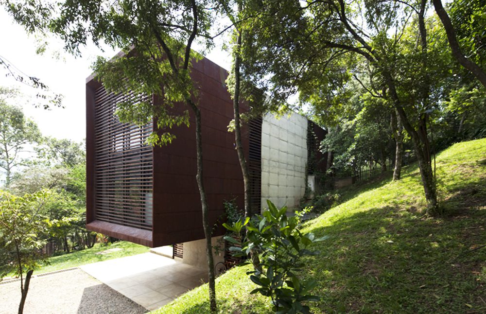 Para responder a esas características, el arquitecto Joe Delgado propuso esta casa con una tipología poco común para una construcción campestre en el Valle del Cauca. Consiste en un volumen compacto compuesto por tres cubos de 5 x 5 metros de base cada uno: el central es de concreto a la vista y los de los extremos se recubrieron con una persiana de madera y una lámina de acero corten protegida por una pátina de óxido.