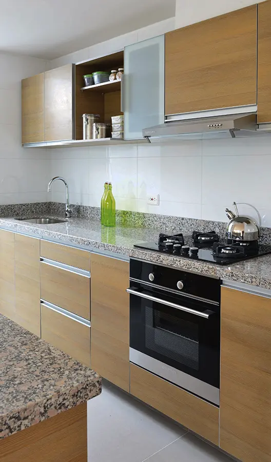 Sentido práctico/ Compacta en sus dimensiones, una cocina lineal con superficies de granito y muebles de MDF con recubrimiento melamínico en tono de cedro es una solución práctica para espacios reducidos. El mesón de trabajo, con el lavaplatos a un extremo, está equipado por Challenger con una estufa a gas con cuatro quemadores italianos, horno convencional y campana extractora con filtro de carbón activado y filtro atrapagrasa. Todos los elementos se identifican por la sobriedad de sus líneas y superficies, y sus acabados de vidrio y acero inoxidable.