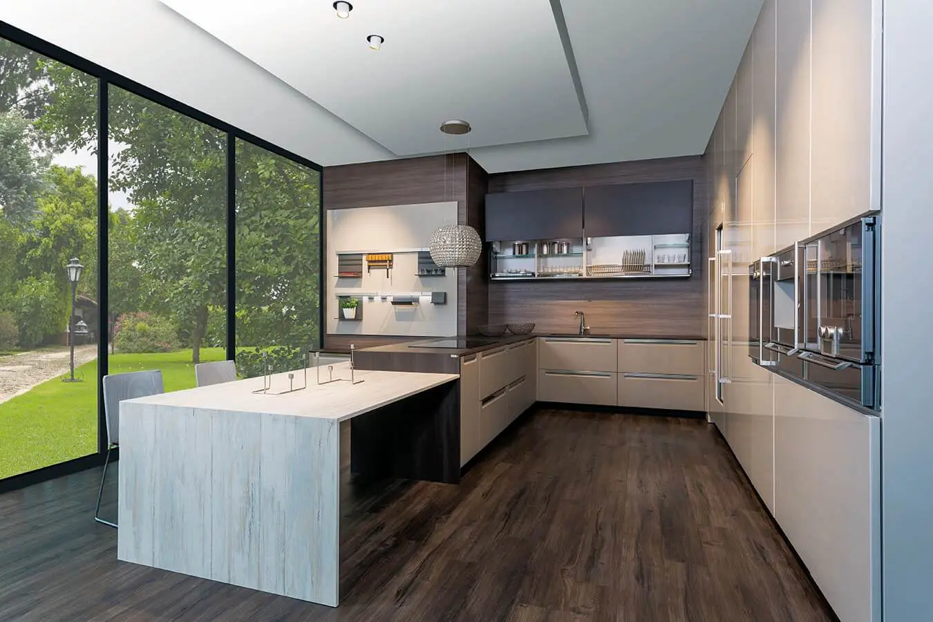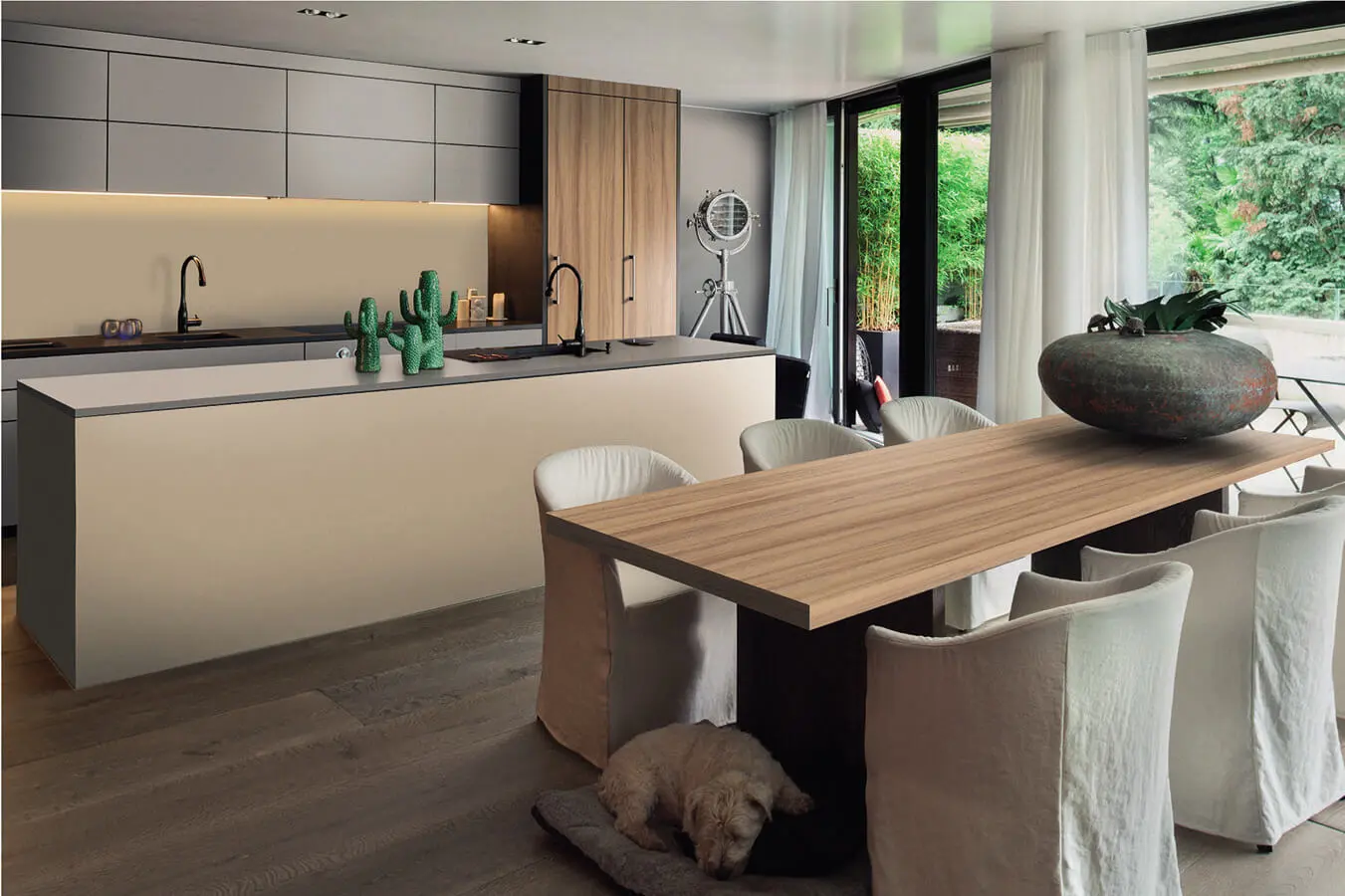 En paz con la naturaleza/ Con el perfeccionamiento de la técnica de la resina termoendurecida, Lamitech le da un respiro a la naturaleza en cuanto a la demanda de maderas decorativas. La referencia Real Decorative Techveneer, material de biopolímero compuesto, reproduce con perfección la textura de la veta y el color de las chapillas de madera natural, como lo muestra un diseño de cocina-comedor que combina superficies con aspecto de haya con paneles grises sobre un piso de listones en tono de nogal, para un efecto informal sosegado y relajante.