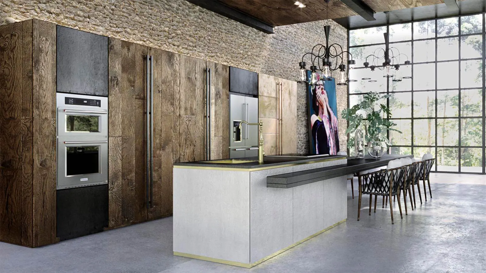 La belleza del acero/ Mostrar la cocina es una invitación a lucirse con los acabados y con la calidad de los equipos que se instalan. Un ambiente con fuertes texturas de piedra y paneles de nogal recuperado matiza su aspecto con la torre de hornos con microondas de 30” y la nevera tipo French Door de cinco puertas, ambos de KitchenAid, equipos que hacen parte del extenso surtido de marcas de Casa Magna.