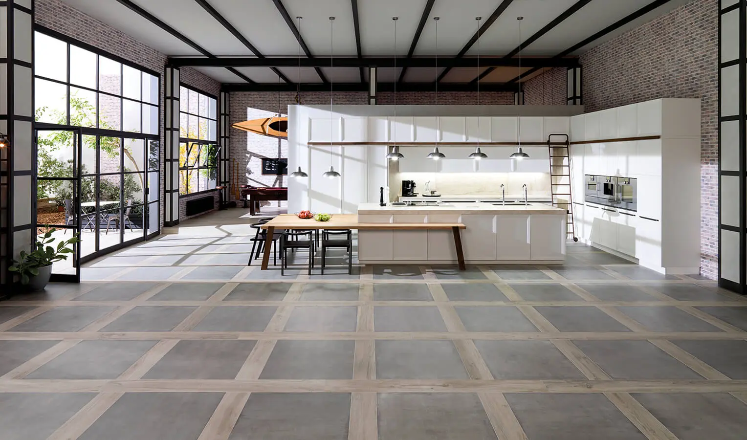 Evocación industrial/ Bajo la luz de las lámparas Charles, la cocina Emotions e4.40 adquiere un aire industrial que se matiza con el toque rústico y natural de la mesa de roble puro de 7 cm de espesor, la cual se integra con la isla, fabricada en chapa de roble con acabado en porcelana mate con superficie de trabajo de granito. El mueble de las alacenas enmarca un aparador, cuyo salpicadero está compuesto por superficies deslizantes de granito Perla Venata que ocultan anaqueles de almacenamiento. Una escalera con ruedas apoyada contra una platina de acero al óxido da acceso a los estantes más altos, mientras que el mueble lateral permite la organización de los hornos en disposición horizontal. Todo el conjunto es producido por Gamadecor, firma de Porcelanosa Grupo.