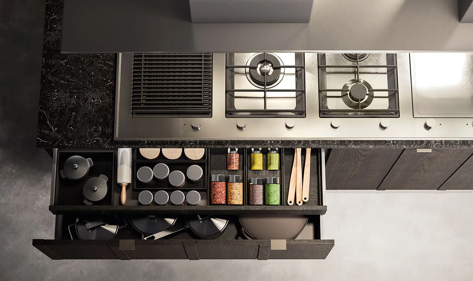Pasión italiana/ El gusto por el arte, el diseño y la tecnología se unen con la pasión por el buen comer en Italia, de donde Santa Julia importa sus líneas de muebles y equipos para cocinas, dentro de las que se destaca la marca Valdesign, del grupo Alf Italia. El modelo Maggiorana, de la diseñadora Bruna Vaccher, combina el aspecto rústico del olmo natural con el acero de la estufa y la campana de extracción de aire. La superficie de mármol de la isla tiene como base un mueble de modulación vertical con cajones extraanchos montados sobre correderas de trabajo pesado para tener en orden y a la mano todos los utensilios y elementos para el uso diario.