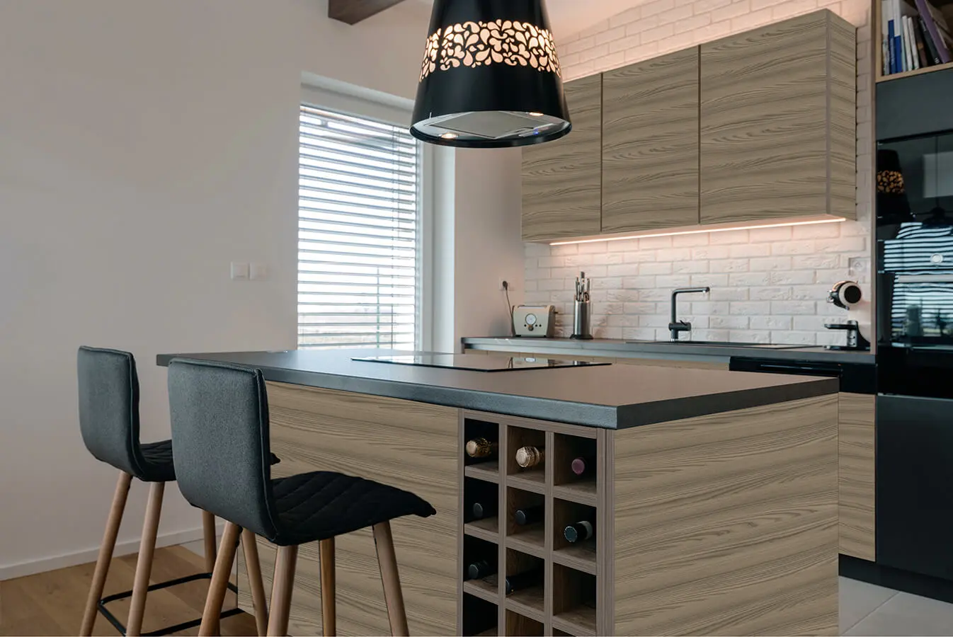 Precisión y desempeño/ Los diseños de extrema sencillez, como el de esta cocina que alterna tonos de madera clara con superficies en negro y gris mate, exigen una ejecución perfecta en todas sus dimensiones, empates de superficies y ajuste de puertas y accesorios. Maquinarias alemanas e italianas, materiales de primera calidad y cerca de dos décadas de experiencia son los principales ingredientes de la fórmula con que Distribuciones Jopsi manufactura en Bogotá sus muebles y dotaciones de carpintería arquitectónica. Asimismo, su mobiliario se fabrica con precisión y está equipado con herrajes Blum y accesorios de altas especificaciones para un desempeño confiable y eficiente.