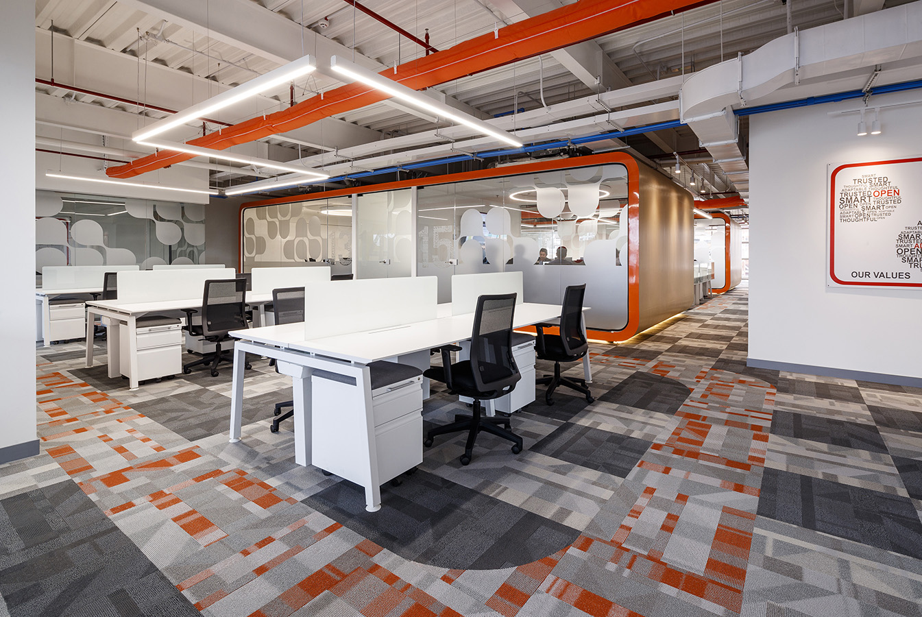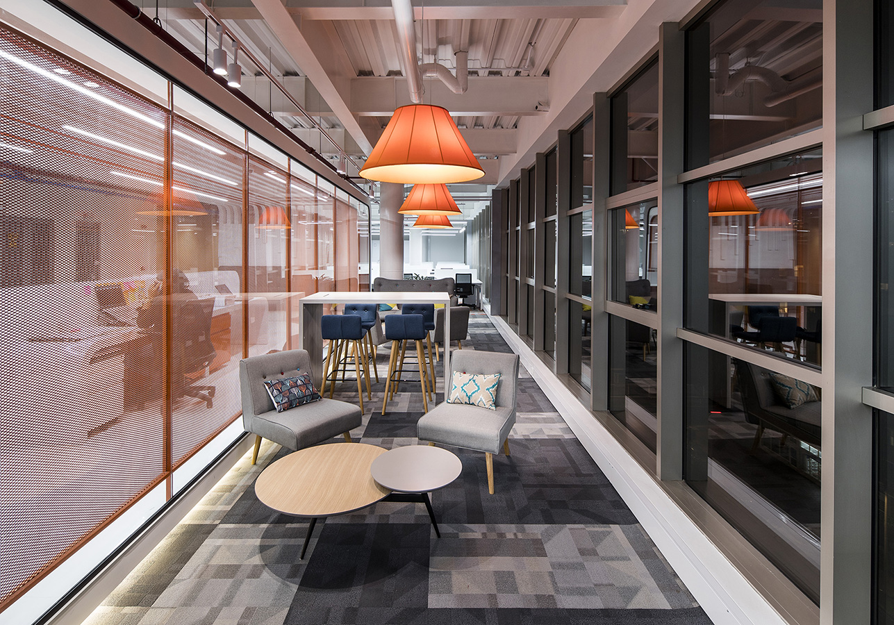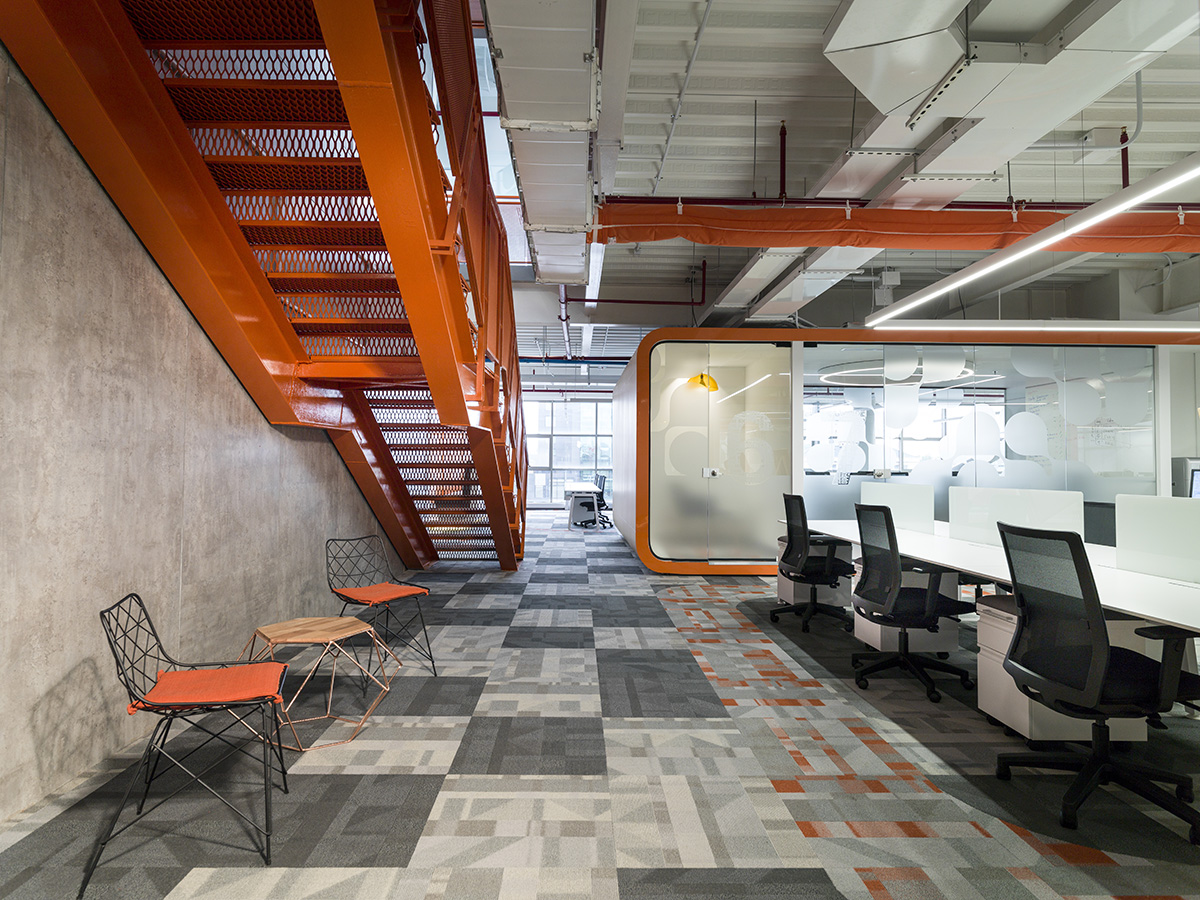 Adicionalmente, los acabados también tienen un carácter protagónico. De ahí que sumen cualidades indispensables al proyecto, como la calidez y el confort. Sin ir más lejos, la alfombra modular de la firma Cuperz, representante de Shaw Contract en Colombia, aporta una apariencia sofisticada y al tiempo vibrante; incluye los colores corporativos de la colección Mindful Play, conservando la estética original del diseño y —ante todo— la unión entre ambos lenguajes (nacional e internacional).