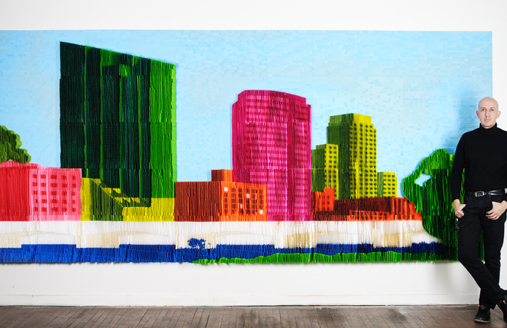 Carlos Blanco siempre había sentido inclinación por las artes y estudió arquitectura como una de ellas, pero no estaba cómodo porque no se expresaba con libertad. Sin embargo, aún hoy, en su trabajo en el estudio del centro de Bogotá afloran los rasgos temáticos del arquitecto y esa lúdica que caracteriza los procesos constructivos está presente en su obra: desde las esculturas inflables con las que salió a muchas calles del mundo a hacer intervenciones, o que expuso en museos como una manera de expresarse contra la violencia en el país –el Carro Bomba, Los Emigrantes–, hasta la obra actual, construida con post-it. Siempre empieza como el arquitecto, con bocetos, con dibujos, con indicaciones sobre planos.