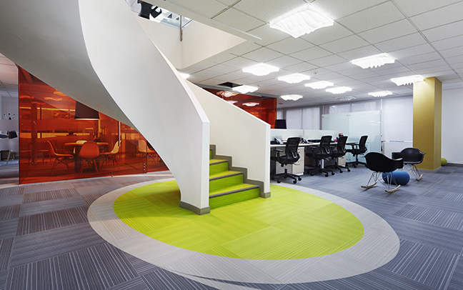 El equilibrio entre lo orgánico y lo geométrico ofrece dinamismo al espacio, evidenciando la versatilidad y el color de la colección del piso Sticks y la tela Oporto, ambas de Proquinal.