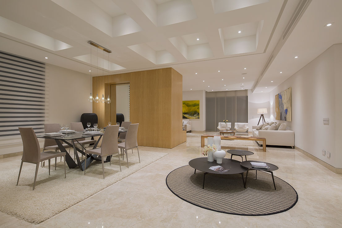 Otro punto a destacar es el trabajo de iluminación realizado en el cielorraso, en especial en el comedor, el primer espacio que los visitantes detectan al pasar la puerta de ingreso. Allí, nichos de forma rectangular tienen ojos de buey cada 30 centímetros para generar una iluminación dramática. “Solo hicimos este juego en el cielorraso del comedor para no recargar la zona social y para generar impacto al entrar al apartamento. Ese tipo de nicho lo planteo en casi todos mis proyectos”, afirma.