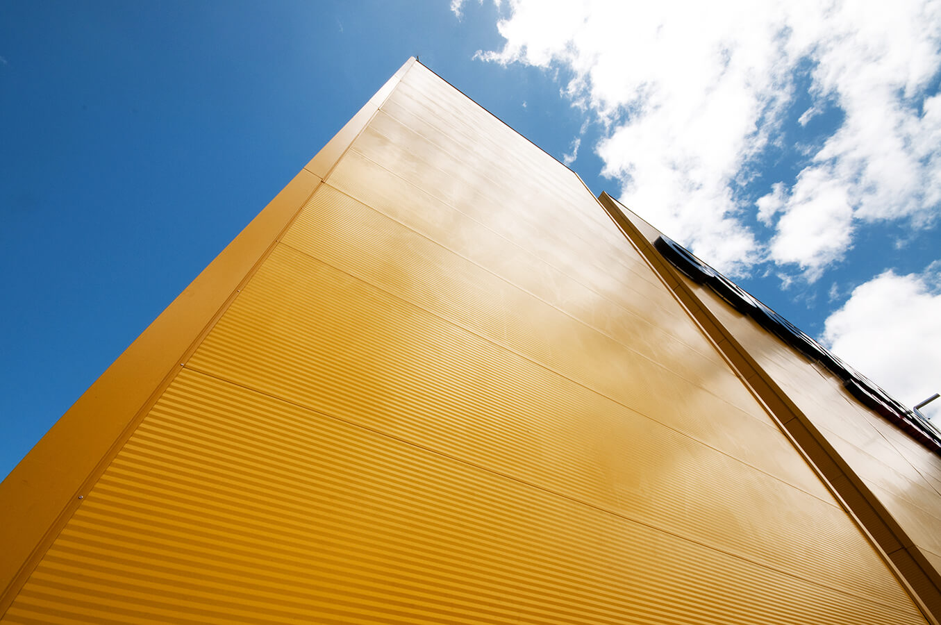 Para la tienda de Homecenter en el barrio Cedritos, en Bogotá, la compañía Metecno suministró para la fachada su producto Superwall 50, y para la cubierta, Techmet 50. Estos son paneles con dos caras de acero prepintado y con un aislamiento en espuma de poliisocianurato (PIR). La selección de estos productos se basó en tres características: la baja transmisión térmica que tienen, lo que permite optimizar el diseño de ventilación natural y mecánica; el uso de colores tanto en las fachadas –con tonos corporativos– como en cubiertas –con colores que por su valor de SRI (índice de reflectancia solar) reducen el efecto de isla de calor; y, finalmente, por su rápida instalación –un promedio de 400 m2 de área cubierta por día–. Debido a que aportan a la reducción de la isla de calor y tienen una baja transmisión térmica permiten disminuir el uso de equipos de ventilación mecánica, lo cual se traduce en una reducción considerable en el consumo de energía.