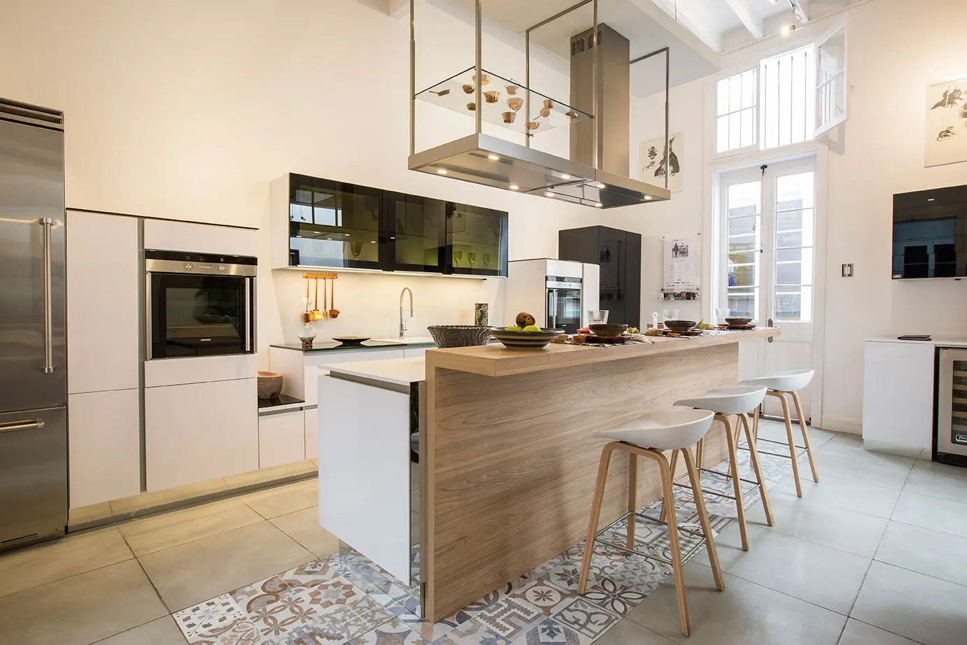 La doble altura de este espacio, diseño de Tete Anavitarte (Casacor, Perú), permite el desarrollo de una cocina vertical, amplia y aireada. El blanco impoluto de los muebles y las superficies lisas y brillantes generadas por el vidrio y el metal de los electrodomésticos resaltan, por medio del contraste, la calidez del tablero de melamina Olmo Alpino, de la firma Masisa, utilizado en la barra/mesón-comedor. De igual manera, el mosaico del suelo, colorido y aleatorio, juega con la superficie gris general, llevando la mirada a la isla central que adquiere todo el protagonismo.