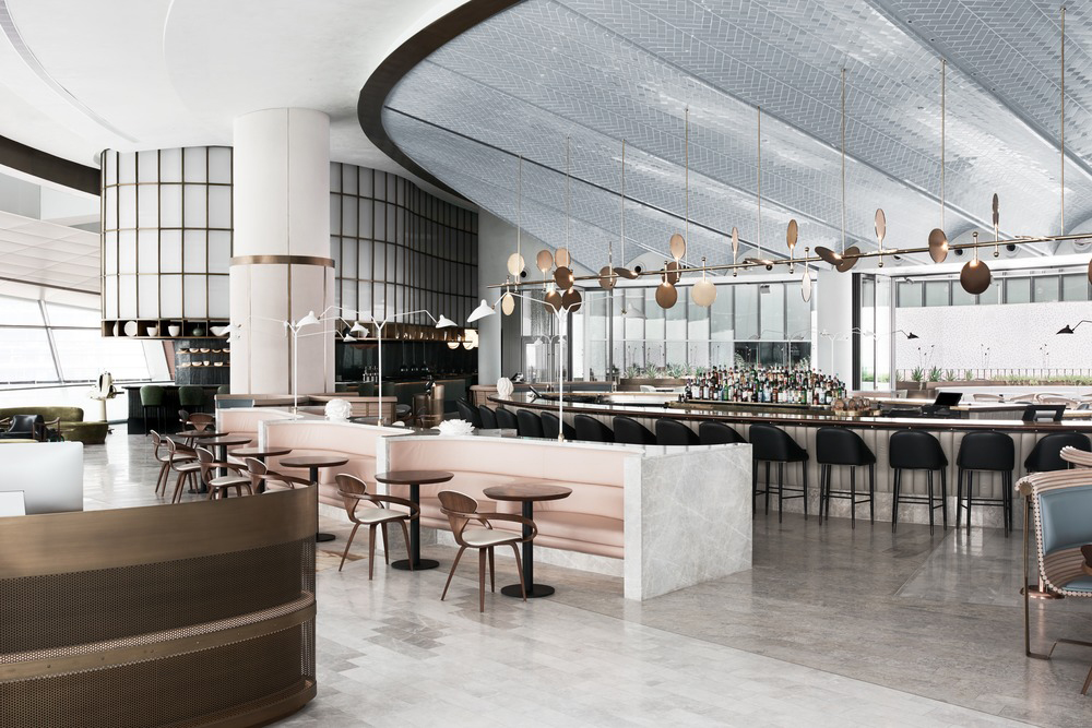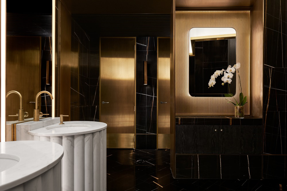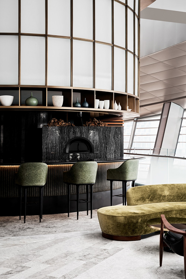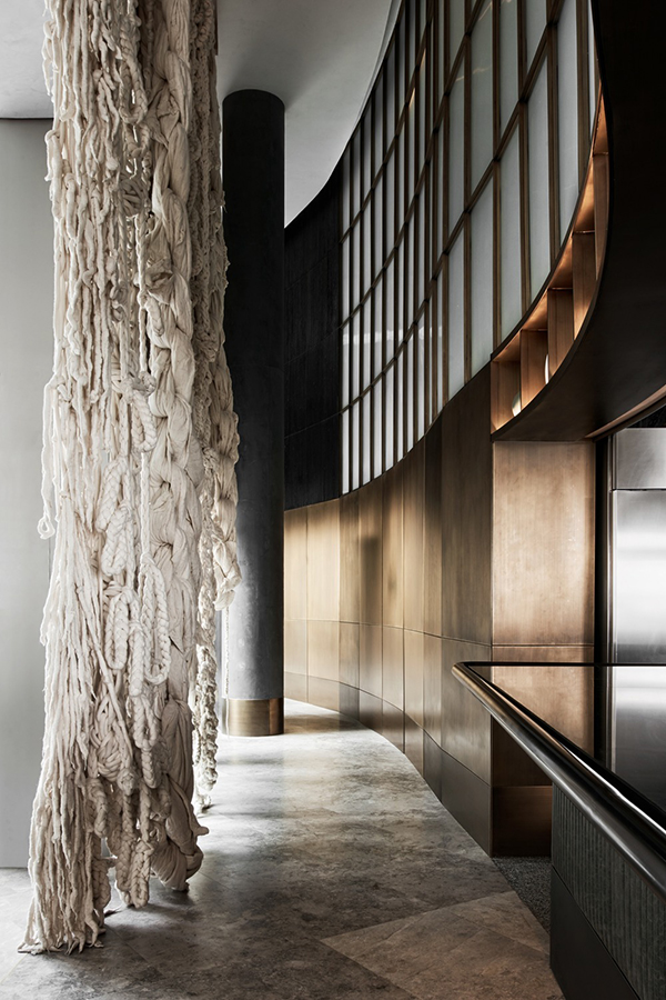 Las tejas abovedadas del techo que hacen referencia tanto al interior de una ostra como a las geometrías icónicas de la Ópera de Sídney son preciosas y reflectantes. Los espacios principales se centran en el cóctel central Pearl Bar, construido en cuero gris, madera de nogal y mármol amarillo. Las banquetas de mármol gris con su cuero rosa son un recordatorio de los delicados contrastes de los corales oceánicos y las criaturas marinas, mientras que las barras crudas y de fuego nos recuerdan los bordes exteriores de las conchas marinas ennegrecidas. En consonancia con el tema antípoda, Jacqui Fink, una pionera internacional creó una obra de arte personalizada colgante de 6 m de altura (una de sus comisiones más grandes hasta la fecha) como un guiño a los tentáculos de las criaturas marinas, delicadas y místicas.