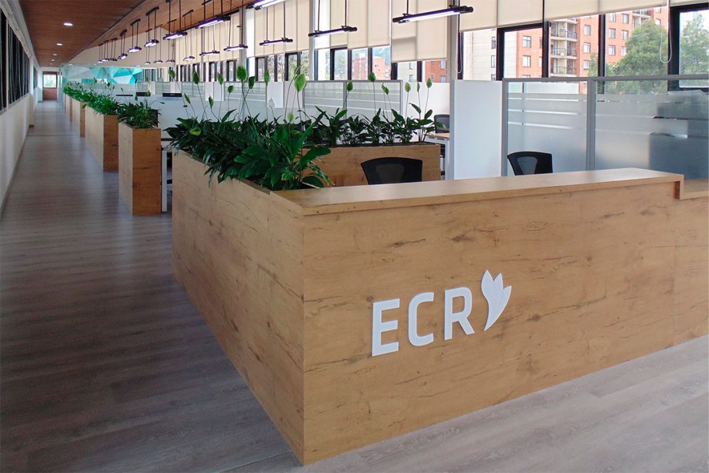 Las oficinas de la ECR ahora tienen una planta totalmente abierta, atravesada por un largo pasillo formado por semi muros de madera que albergan las macetas con plantas. Estas le aportan al espacio un contacto directo con la naturaleza, aspecto esencial para un desarrollo psicológico y físico a plenitud.