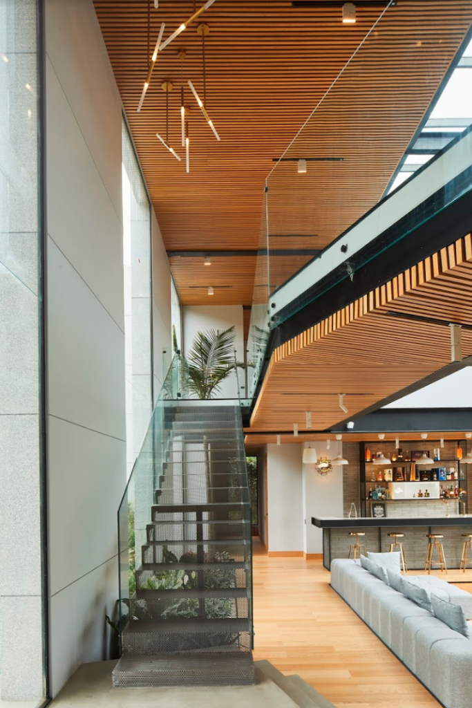 Todos los cielorrasos de la casa tienen un trabajo hecho en listones de madera, que aporta calidez y armoniza con los demás materiales.