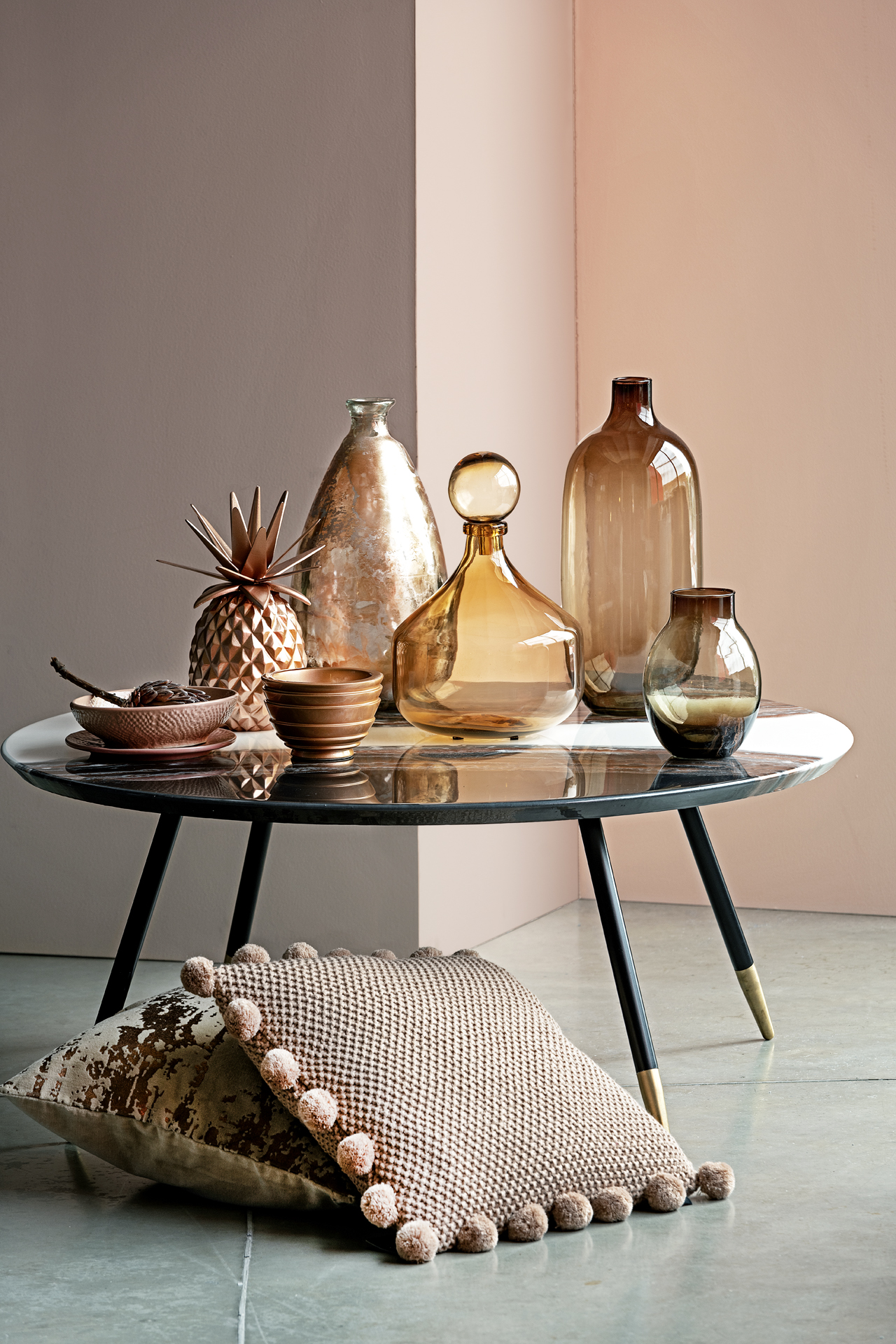Mesa de resina, diseño Juanita Echeverry; funda de cojín, ref. Bolme, de algodón, marca Eightmood (abajo, a la derecha); botella, ref. Orbital, de vidrio, marca Eightmood (en el centro, con tapa redonda), todo lo anterior en Belgravia Luxury Home. Plato y bowl, de cerámica rosa, de Interiority. Piña de madera, tallada a mano por artesanos de Barú; cuenco de madera torneada, con acabado en pintura de poliuretano, todo lo anterior de Zientte. Florero, ref. Organic, de vidrio efecto cobre (en el centro); floreros, ref. Dinamarca y Zeus (el pequeño), de vidrio caramelo; funda de cojín, ref. Algodón cobre, todo lo anterior de Tugó.